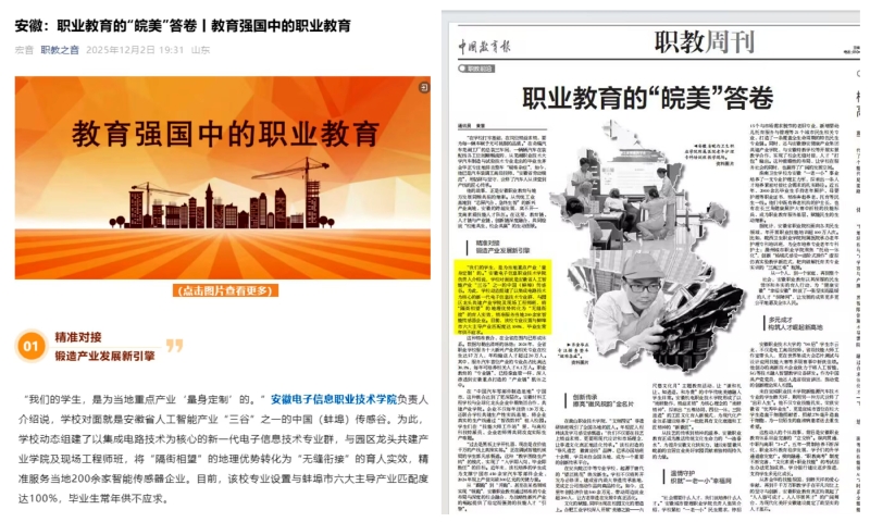 本网讯 近日,学院在职业教育校企合作领域的系列成果引发主流媒体广泛关注。中国教育报、职教之音先后以《职业教育的“皖美”答卷》《安徽:职业教育的“皖美”答卷丨教育强国中的职业教育》为题,深度报道我院以校企合作为抓手,推动职业教育高质量发展的实践经验,引发社会各界热烈反响。