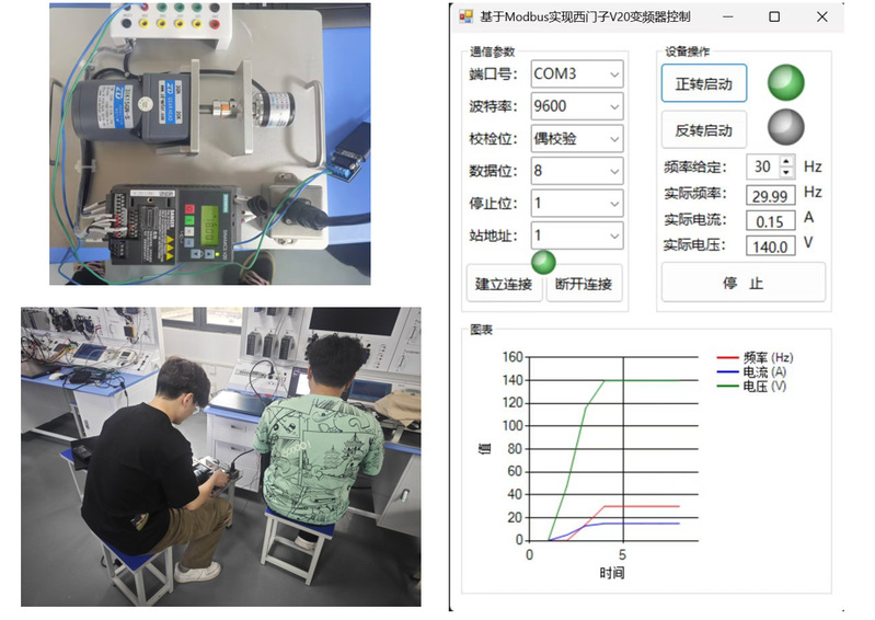 针对变频器应用项目,学生需要通过串口(RS485)、ModbusRTU等协议直接与变频器交互,实现对西门子变频器的正转启动、反正启动、停止、频率输出调整、电压电流实时显示等功能。